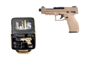 Taurus TX22 Competition 22LR Optic Ready Pistol w/ Threaded Barrel - FDE / Black - 16+1 Rounds, 5.4" Barrel, Polymer Grips, FDE/Tan. From the short, smooth pull of its precision-designed Taurus Performance Trigger System (PTS) to the built-in comfort of its ergonomic grip, the TaurusTX 22 Competition is one performance-driven full size thats ready to race right out of the box. The TaurusTX 22 Competition model comes with 2 two-sided adapter plates to easily mount almost any red dot sight. Includes three magazines and soft case.